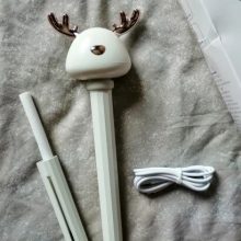 A very nice and elegant humidifier. It works perfectly. It is plastic (tough), colored white. The horns and nose are metallic in color. Comes with a manual, a cable to be able to charge. Add that the power button is the nose.